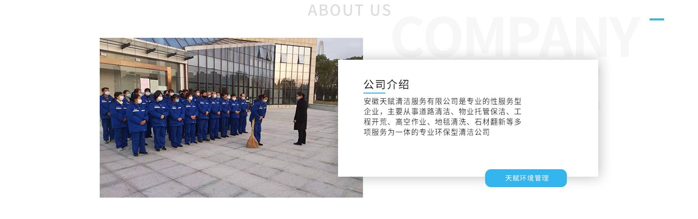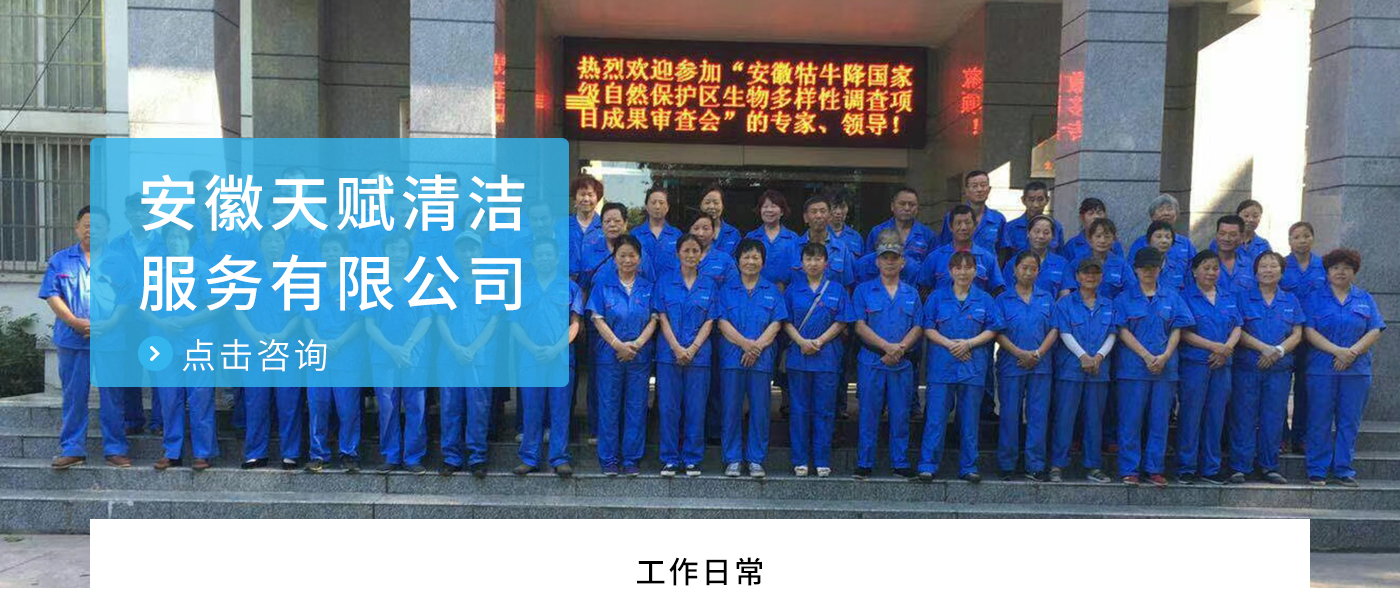 安徽天賦清潔服務(wù)有限公司是的服務(wù)型企業(yè),主要從事道路清潔、物業(yè)托管保潔、工程開(kāi)荒、高空作業(yè)、地毯清洗、石材翻新等多項(xiàng)服務(wù)為一體的環(huán)保型清潔公司。公司管理機(jī)制完善,清潔作業(yè)經(jīng)驗(yàn)豐富,擁有技術(shù)力量,嚴(yán)格實(shí)行崗前培訓(xùn)—崗中督查—上崗在培訓(xùn)的員工管理措施,憑著優(yōu)良的清潔質(zhì)量和嚴(yán)格的督查管理,為眾多企事業(yè)單位、醫(yī)院、酒店、廠區(qū)商場(chǎng)、物業(yè)、道路、學(xué)校、公園等提供后勤清潔服務(wù)。在業(yè)內(nèi)擁有良好的口碑。工作人員,服務(wù)態(tài)度優(yōu),竭力為客戶提供好的保潔服務(wù)。安徽天賦清潔服務(wù)有限公司:致力于長(zhǎng)期合作關(guān)系,提高服務(wù)質(zhì)量,提供高標(biāo)準(zhǔn)的清潔服務(wù)。公司的經(jīng)營(yíng)理念:為營(yíng)造一個(gè)更清潔、亮麗的生活和工作環(huán)境而努力!“誠(chéng)信”是公司成功保證?!翱蛻糁辽希抛u(yù)為首”是公司宗旨。高標(biāo)準(zhǔn)提供服務(wù),維護(hù)客戶利益、形象,是我始終不渝的目標(biāo)。